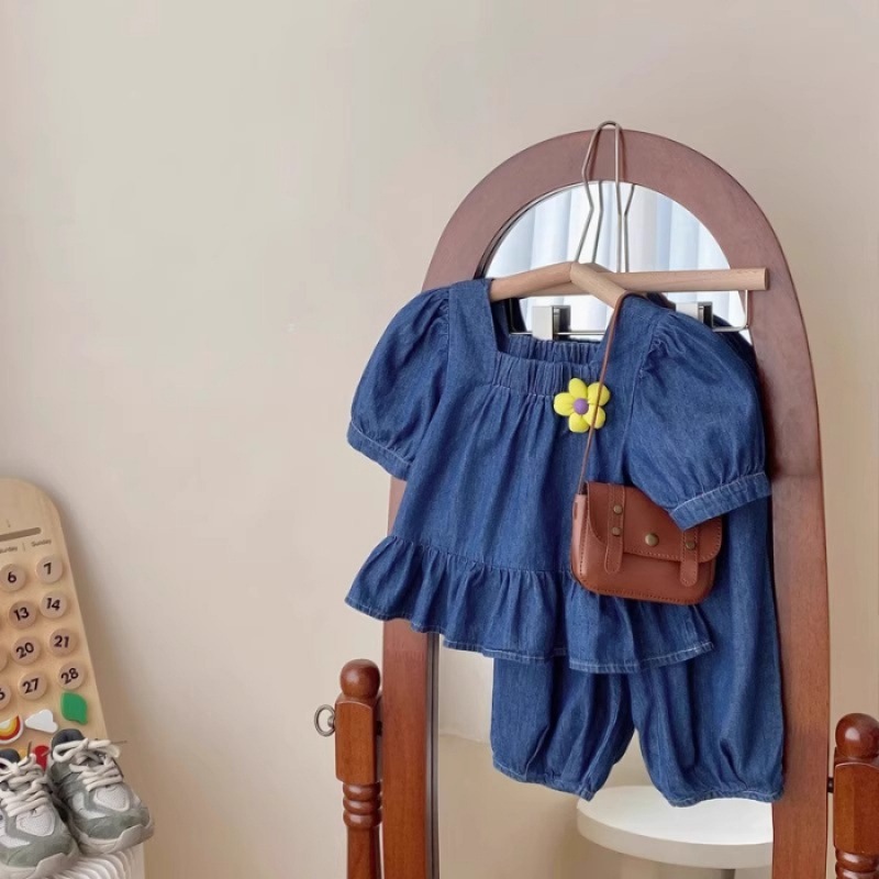 2024 Summer Girls' Thin Denim Set Summer Clothing Short sleeved Top, cropped pants Children's Sportswear