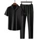 2Pcs/Set Turn-down Collar Elastic Waistband Pleated Casual Outfit Short Sleeve Shirt Drawstring Long Pants Set Male Clothing