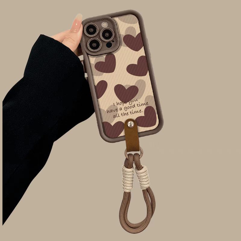 Compatibel met iPhone 16, 15, 14, 13, 12, 11, PRO, MAX, XR, XS, X, 8, 7, 6, 6S PLUS, volledige beschermende hoes, esthetische bruine harten en lanyards