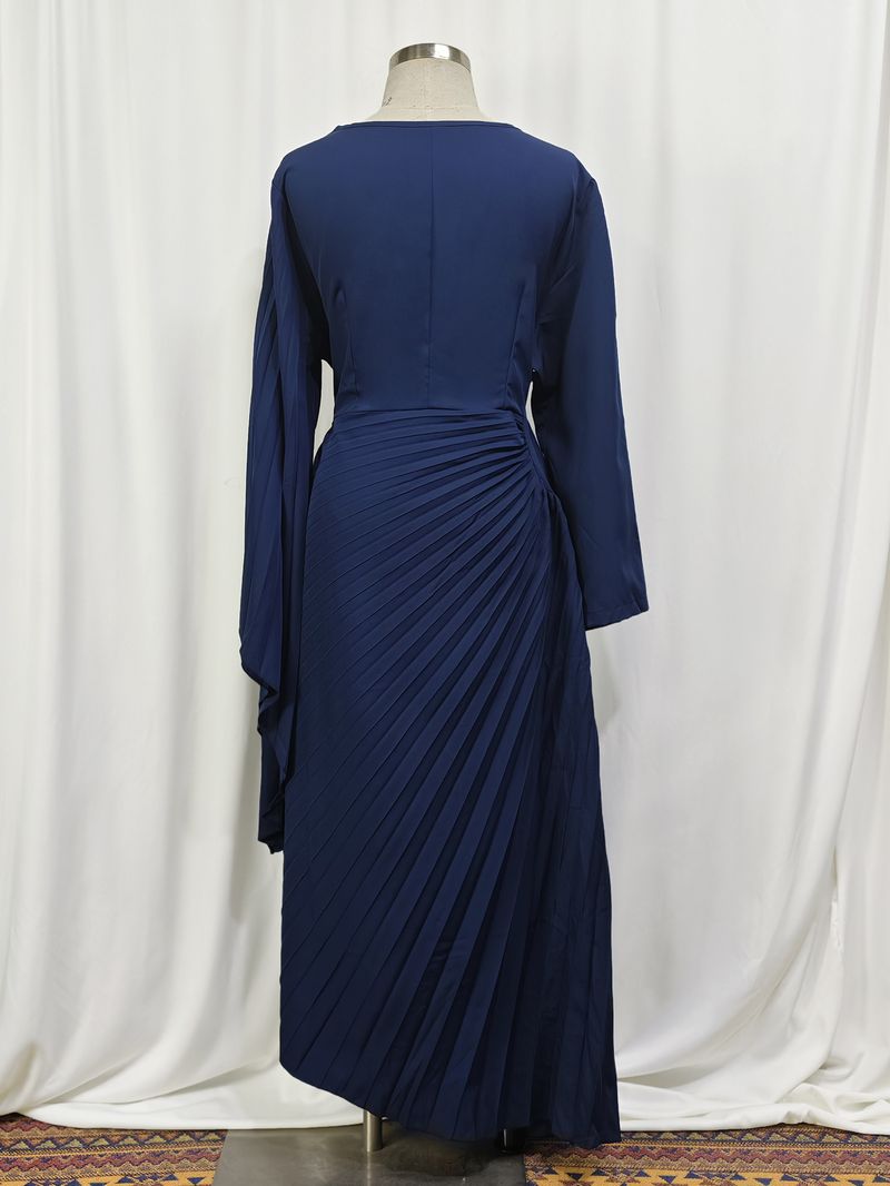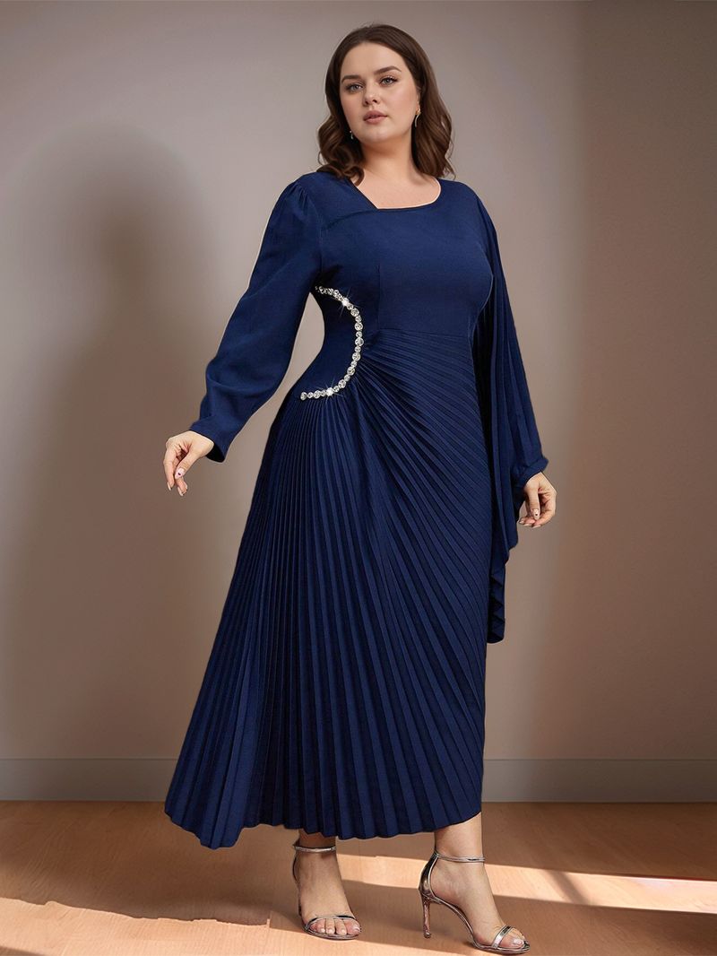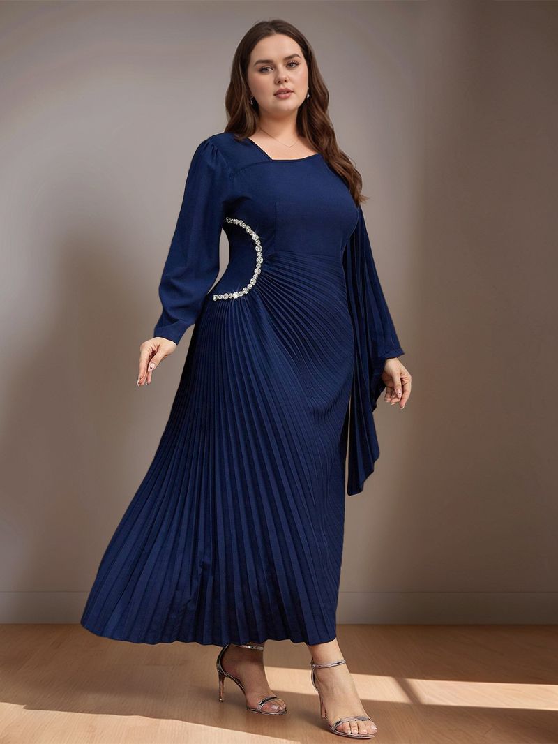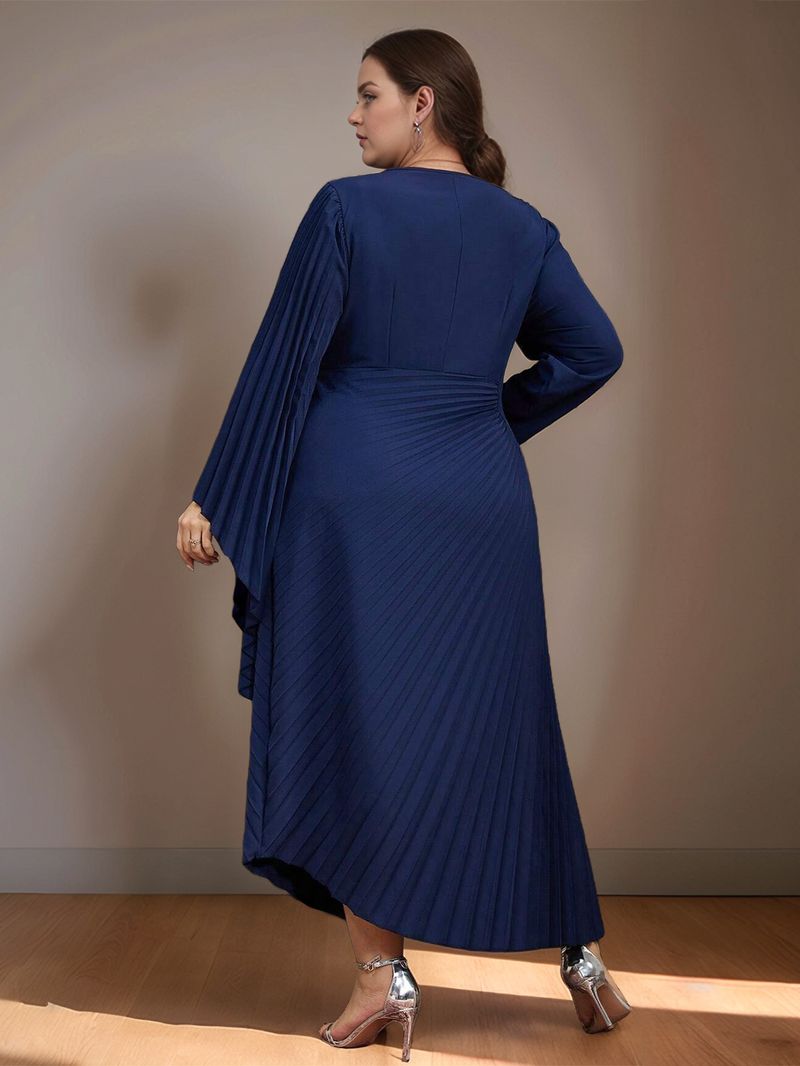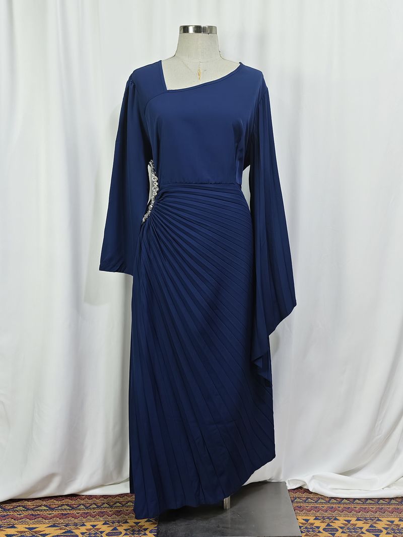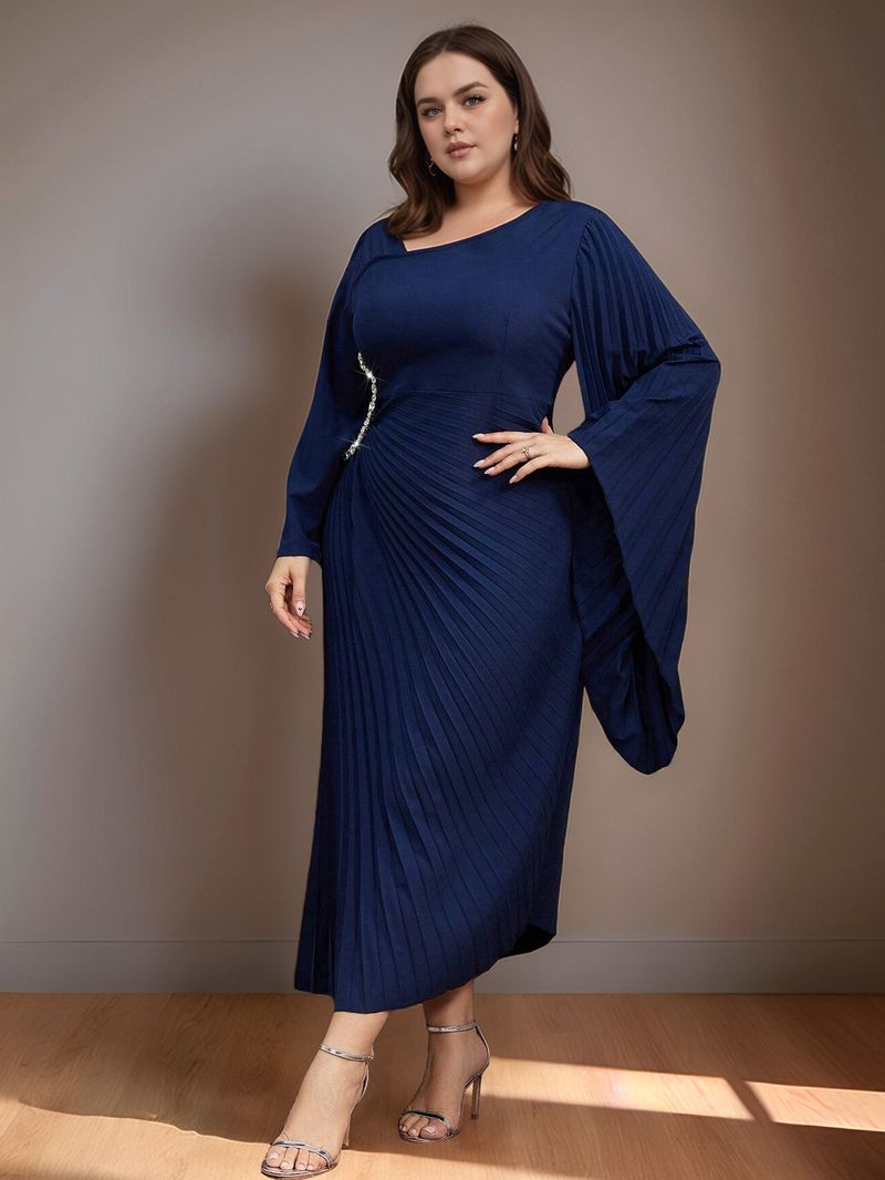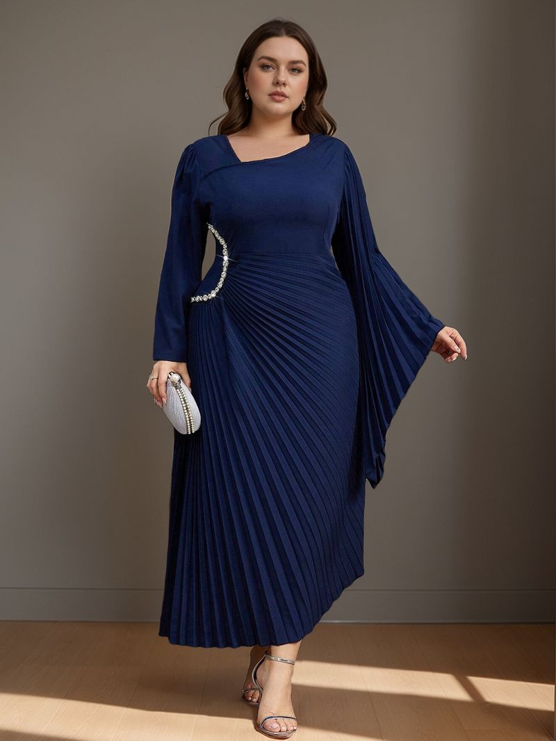 Dameskleding Modieuze asymmetrische geplooide jurk met trompetmouwen en diamanten studs