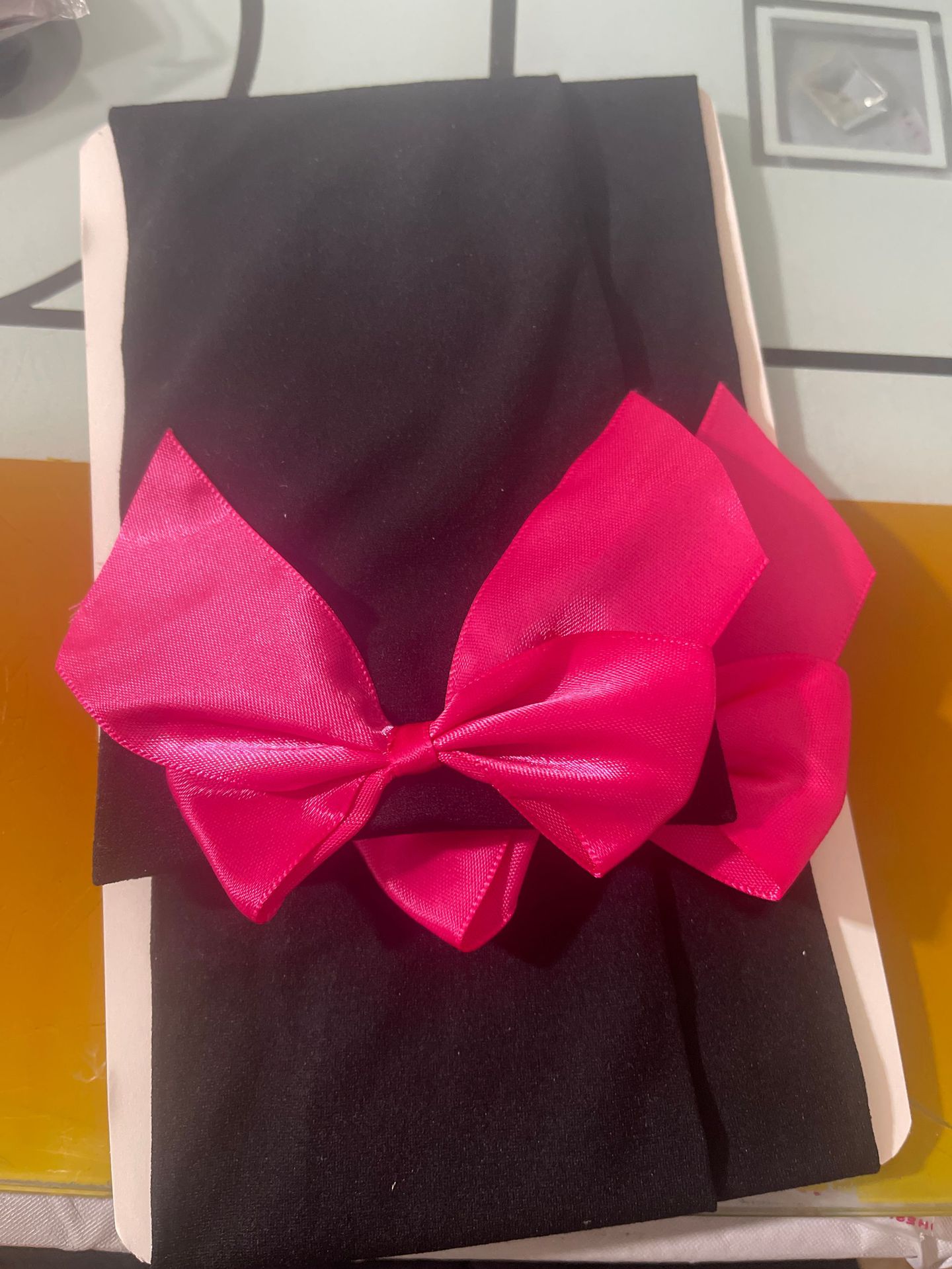 Roze strik + zwarte sokken