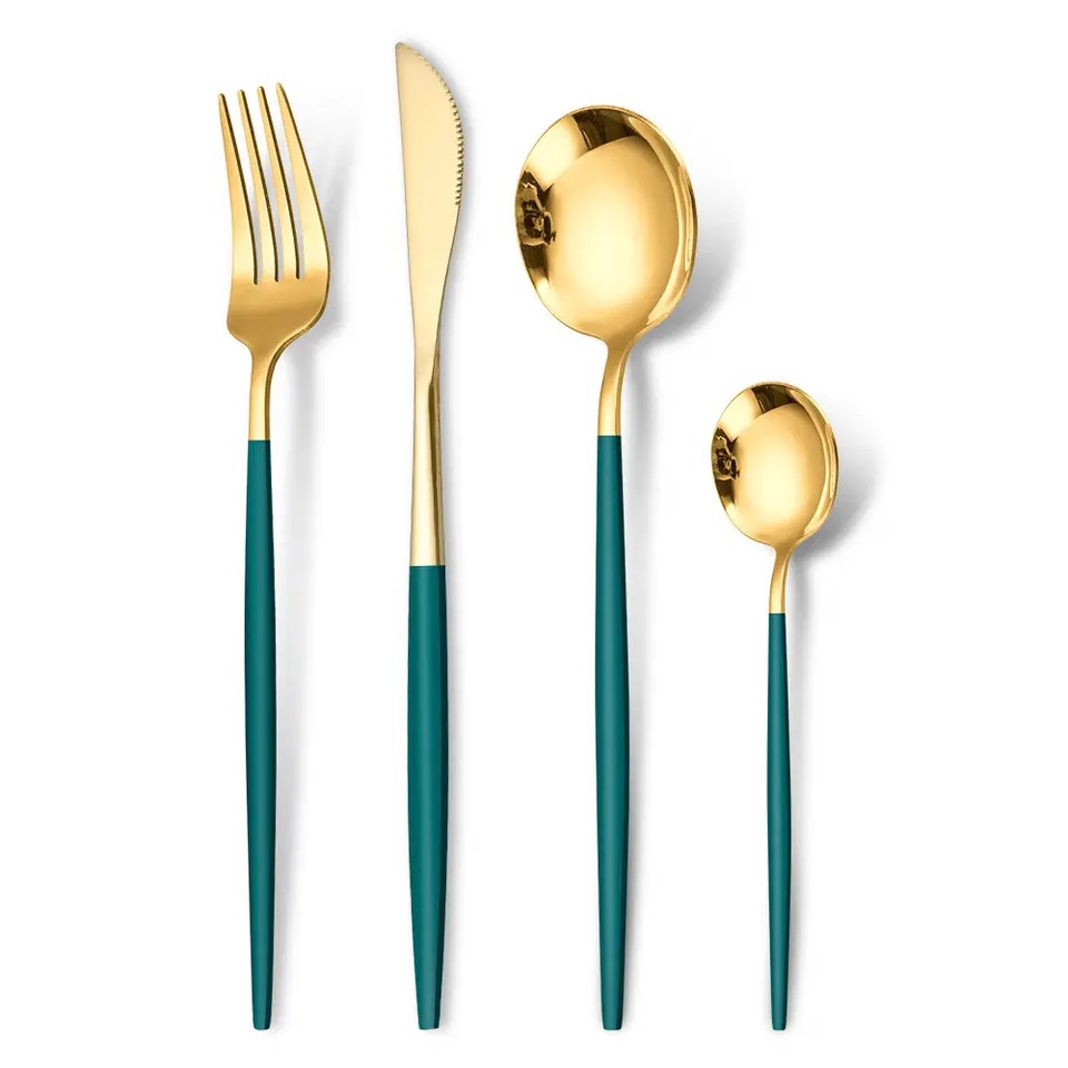 Gouden bestekset Vorken Lepels Messen Servies Stalen bestekset Roestvrijstalen serviesset Lepel Mes Vork Aangepast logo