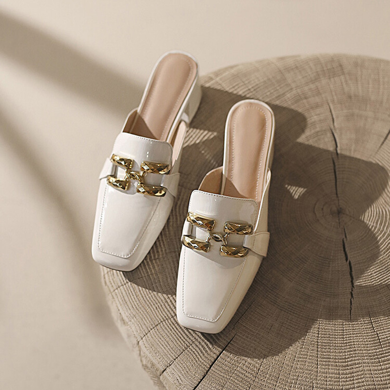 halve pantoffels voor dames zomer nieuwe stijl temperament lakleer veelzijdige medium hak dikke hak vierkante neus Muilezelsandaal pantoffels