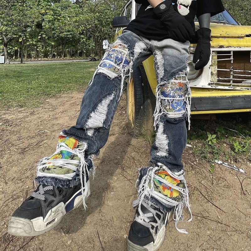 High street scratch washed heavy-duty embroidered ripped jeans men's loose brushed trendy brand fried street straight leg pants