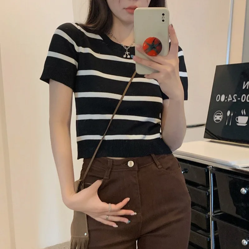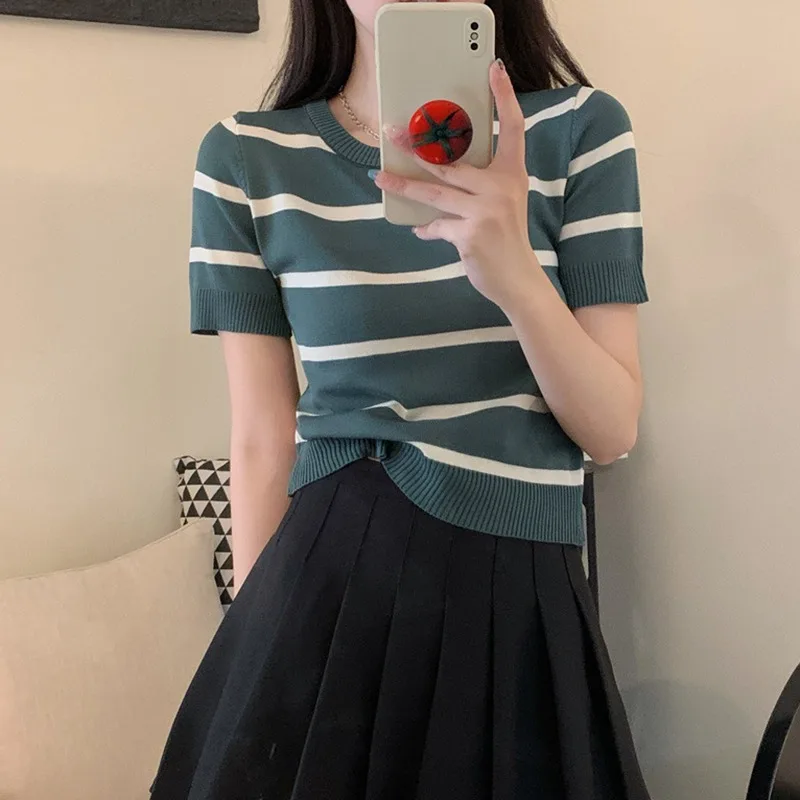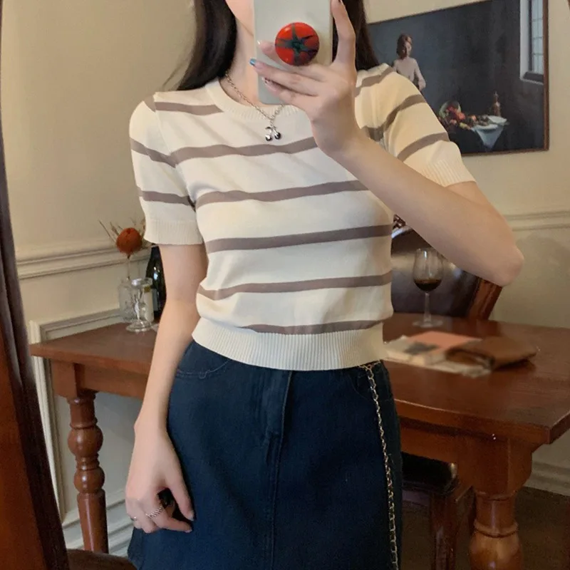 Features: Vintage, Versatile, Short Sleeves, Crew Neck, Pullover, Short, Ice Stripe, Knitwear, T-Shirt, Top, Women