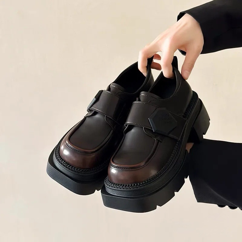 Dames leren 2025 lente nieuwe Britse stijl klittenband vierkante neus mode casual loafers platform dikke zool enkele schoenen