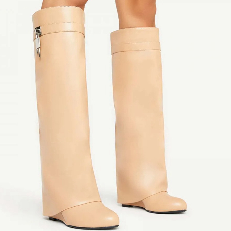 Women's Shoes retro large tube circumference pointed high heel metal lock wedge heel trouser boots foreign trade large size sleeve catwalk high boots