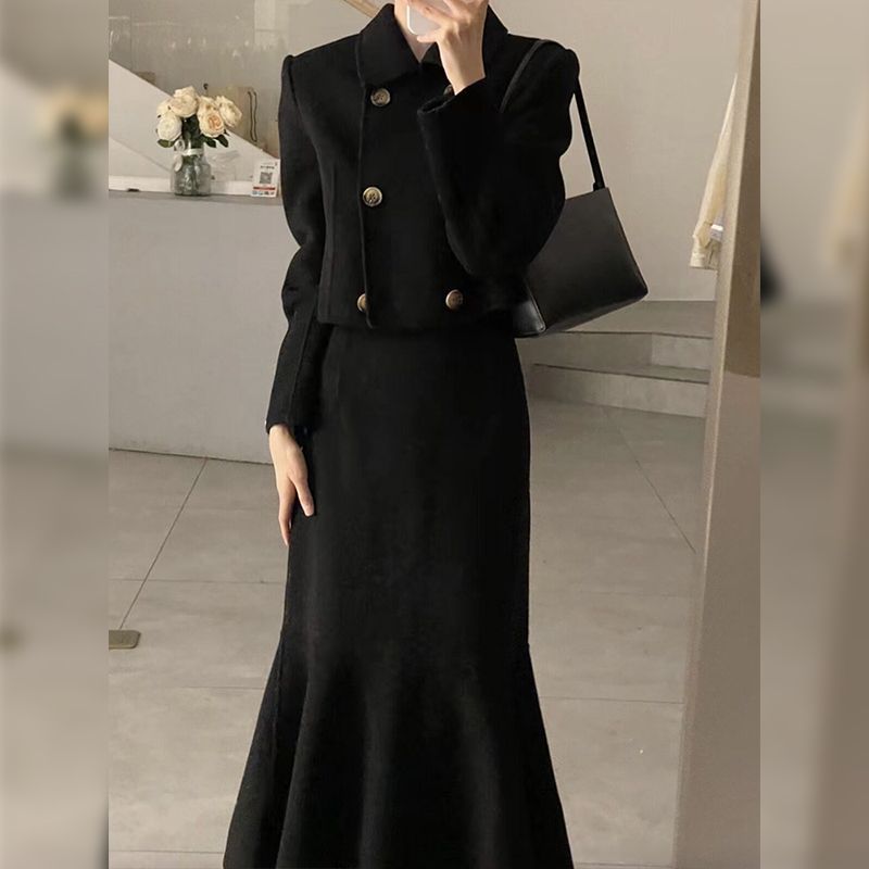 Hepburn-stijl zwarte fishtail-jurk voor dames 2023 herfst/winter nieuw temperament dameskleding high-end gevoel afslanken tweedelige set